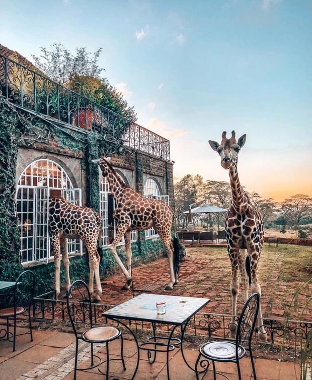 Giraffe Manor là nơi bạn có thể làm quen và ngắm nhìn những chú hươu cao cổ Rothschild quý hiếm và thưởng thức cảnh quan đẹp như một tranh vẽ. Với diện tích là 140 hecta rừng tự nhiên ở vùng ngoại ô Langata Nairobi, đó là một trong những địa điểm thú vị cho những lữ khách khắp nơi đổ xô đến Đông Phi bắt đầu mùa đi săn. Giraffe Manor tuyệt đẹp với mặt tiền và nội thất trang nhã, thanh lịch tạo nên một sức hấp dẫn lạ thường. Tại Giraffe Manor chúng ta bắt gặp những chú hươu cao cổ rất thân thiện đối với con người. Đôi khi bạn sẽ bắt gặp cảnh chúng nhìn chằm chằm vào cửa sổ phòng của bạn, và rất hay thò đầu vào ô cửa sổ phòng ăn sáng. Đây là nơi duy nhất trên thế giới mà bạn có thể vừa tận hưởng thiên nhiên lại có thể thưởng thức những món ăn ngon, vừa được chụp ảnh với những chú hươu cao cổ.